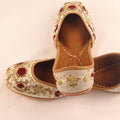 These Pakistani khussas, or Indian Punjabi Jutties are hard to find because of the colour combination they have been given. Ivory upper with maroon embroidery, and golden dabka work and polished beads are adding charm to itself.