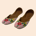 These Pakistani khussas or Indian Jutties are handcrafted by Kashmiri style designers with cut dana, and thread work. Embroidered with threads coloured as yellow, green, and light pink.